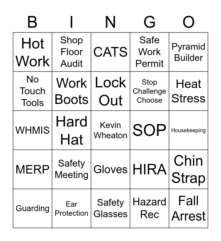 This bingo card has a free space and 24 words: Safety Meeting, Ear Protection, Lock Out, Guarding, Pyramid Builder, Hot Work, No Touch Tools, Shop Floor Audit, SOP, Gloves, Stop Challenge Choose, WHMIS, HIRA, Chin Strap, Work Boots, Hazard Rec, Housekeeping, CATS, Heat Stress, Hard Hat, Fall Arrest, MERP, Safe Work Permit and Safety Glasses.