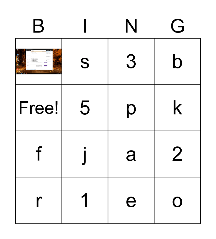 This bingo card has 1 images and 15 words: 1, 2, 3, f, s, a, e, Free!, 5, r, b, j, k, p and o.