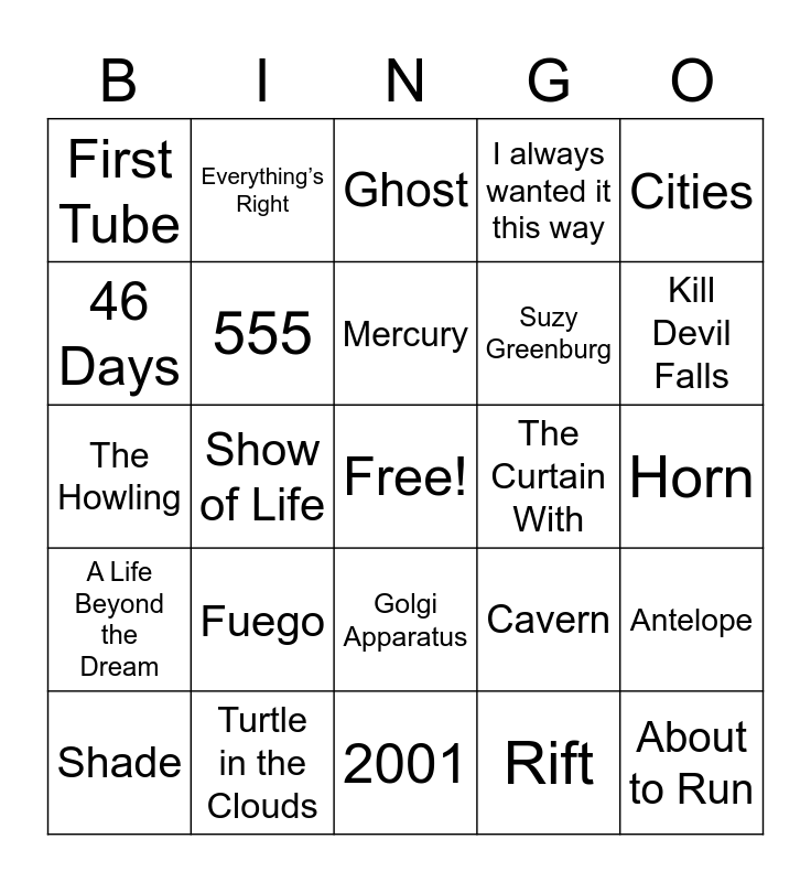 This bingo card has a free space and 24 words: Fuego, Turtle in the Clouds, Mercury, Shade, Cities, First Tube, 46 Days, Everything’s Right, The Curtain With, Golgi Apparatus, Suzy Greenburg, The Howling, Cavern, Antelope, 555, Rift, Horn, Ghost, Kill Devil Falls, Show of Life, About to Run, A Life Beyond the Dream, I always wanted it this way and 2001.