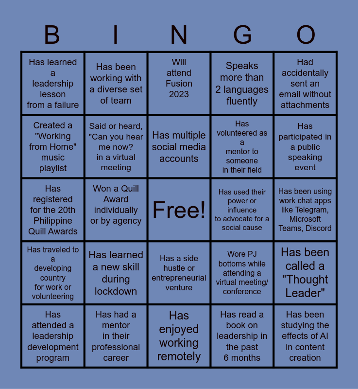 This bingo card has a free space and 24 words: Has learned a new skill during lockdown, Has had a mentor in their professional career, Has multiple social media accounts, Has attended a leadership development program, Had accidentally sent an email without attachments, Has learned a leadership lesson from a failure, Created a "Working from Home" music playlist, Has been working with a diverse set of team, Has used their power or influence to advocate for a social cause, Has a side hustle or entrepreneurial venture, Has volunteered as a mentor to someone in their field, Has registered for the 20th Philippine Quill Awards, Wore PJ bottoms while attending a virtual meeting/ conference, Has been called a "Thought Leader", Said or heard, "Can you hear me now? in a virtual meeting, Has read a book on leadership in the past 6 months, Has been using work chat apps like Telegram, Microsoft Teams, Discord, Will attend Fusion 2023, Has participated in a public speaking event, Won a Quill Award individually or by agency, Has been studying the effects of AI in content creation, Has traveled to a developing country for work or volunteering, Speaks more than 2 languages fluently and Has enjoyed working remotely.
