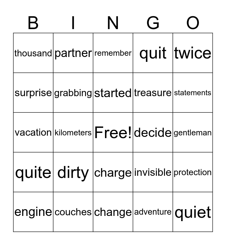 This bingo card has a free space and 24 words: dirty, couches, started, engine, twice, thousand, surprise, partner, decide, charge, treasure, vacation, invisible, protection, grabbing, adventure, gentleman, remember, statements, kilometers, quiet, quite, quit and change.
