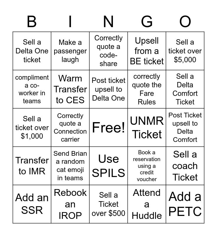 This bingo card has a free space and 29 words: Add an SSR, Book an International Ticket, Correctly quote a Connection carrier, Send Brian a dad joke in teams, Sell a Delta One ticket, Correctly quote a code-share, Warm Transfer to CES, Send Brian a random cat emoji in teams, UNMR Ticket, Rebook an IROP, Post Ticket upsell to Delta Comfort, Add a PETC, Sell a Ticket over $500, Attend a Huddle, Sell a Delta Comfort Ticket, Correctly quote a fare (including all taxes and carrier-imposed fees), Use SPILS, Transfer to IMR, Sell a ticket over $5,000, Sell a ticket over $1,000, Book a reservation using a credit voucher, Ticekt an Infant in arms, correctly quote the Fare Rules, compliment a co- worker in teams, Upsell from a BE ticket, Make a passenger laugh, Sell a coach Ticket, Post ticket upsell to Delta One and Thank a passenger for something specific.