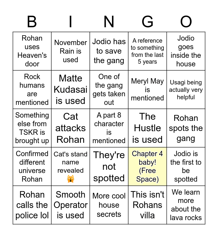 This bingo card has 25 words: Cat's stand name revealed 🙀, More cool house secrets, One of the gang gets taken out, Rohan calls the police lol, Jodio goes inside the house, Rohan uses Heaven's door, Rock humans are mentioned, November Rain is used, The Hustle is used, They're not spotted, Meryl May is mentioned, Something else from TSKR is brought up, Chapter 4 baby! (Free Space), Jodio is the first to be spotted, Matte Kudasai is used, We learn more about the lava rocks, Rohan spots the gang, Jodio has to save the gang, Usagi being actually very helpful, Cat attacks Rohan, A part 8 character is mentioned, Smooth Operator is used, Confirmed different universe Rohan, A reference to something from the last 5 years and This isn't Rohans villa.