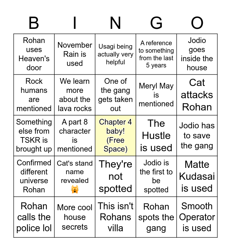 This bingo card has a free space and 24 words: Cat's stand name revealed 🙀, More cool house secrets, One of the gang gets taken out, Rohan calls the police lol, Jodio goes inside the house, Rohan uses Heaven's door, Rock humans are mentioned, November Rain is used, The Hustle is used, They're not spotted, Meryl May is mentioned, Something else from TSKR is brought up, Jodio is the first to be spotted, Matte Kudasai is used, We learn more about the lava rocks, Rohan spots the gang, Jodio has to save the gang, Usagi being actually very helpful, Cat attacks Rohan, A part 8 character is mentioned, Smooth Operator is used, Confirmed different universe Rohan, A reference to something from the last 5 years and This isn't Rohans villa.
