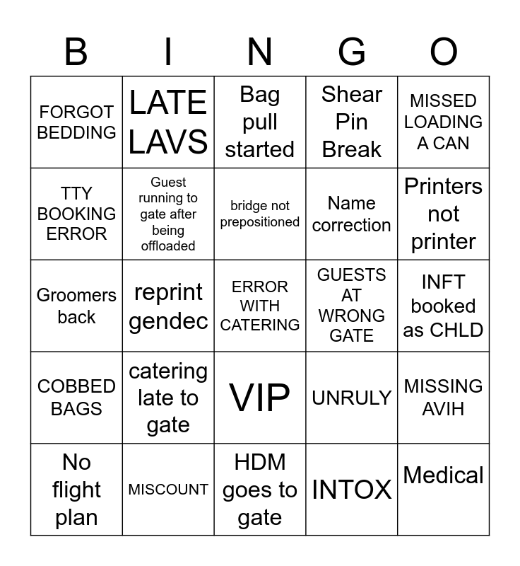 This bingo card has 25 words: COBBED BAGS, MISCOUNT, ERROR WITH CATERING, INTOX, MISSED LOADING A CAN, FORGOT BEDDING, LATE LAVS, Bag pull started, GUESTS AT WRONG GATE, MISSING AVIH, TTY BOOKING ERROR, Guest running to gate after being offloaded, HDM goes to gate, UNRULY, Printers not printer, No flight plan, reprint gendec, bridge not prepositioned, Name correction, INFT booked as CHLD, Groomers back, catering late to gate, VIP, Shear Pin Break and Medical.