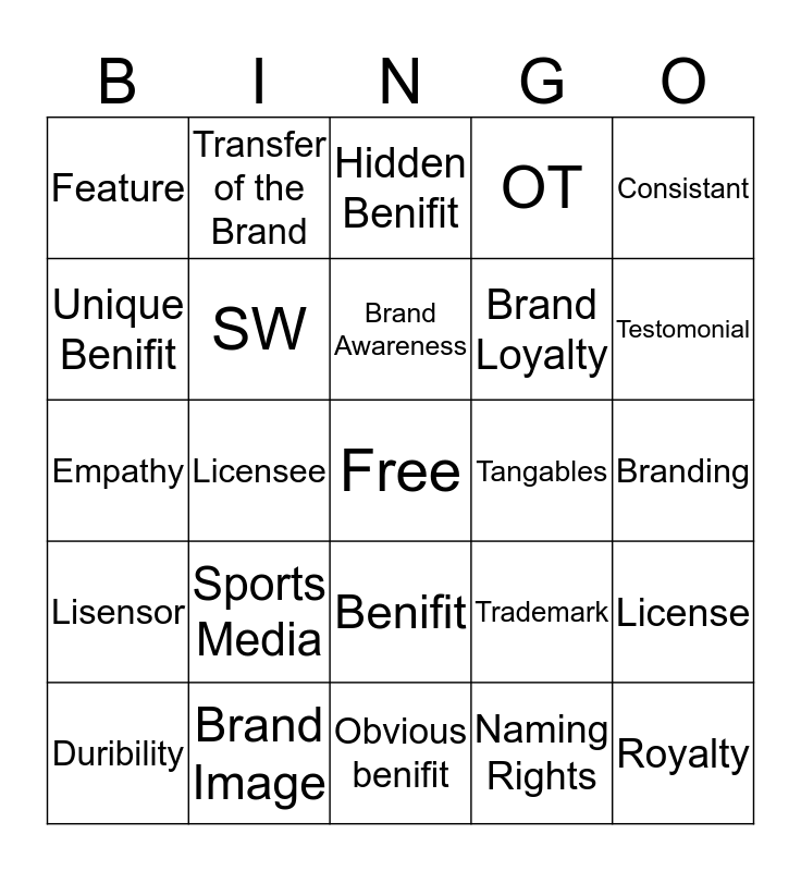 This bingo card has a free space and 24 words: Sports Media, Brand Image, Brand Awareness, Duribility, Consistant, Feature, Unique Benifit, Transfer of the Brand, Tangables, Benifit, Brand Loyalty, Empathy, Trademark, License, SW, Naming Rights, Branding, Hidden Benifit, Testomonial, Licensee, Royalty, Lisensor, OT and Obvious benifit.
