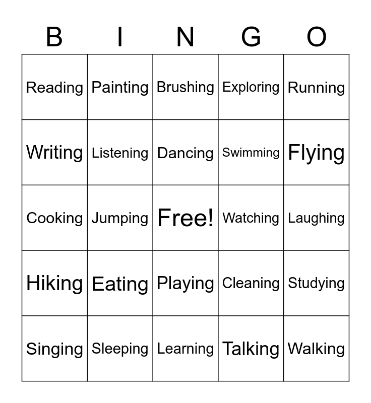 This bingo card has a free space and 24 words: Eating, Sleeping, Dancing, Singing, Running, Reading, Writing, Painting, Watching, Playing, Swimming, Cooking, Cleaning, Studying, Listening, Talking, Laughing, Brushing, Flying, Jumping, Walking, Hiking, Exploring and Learning.