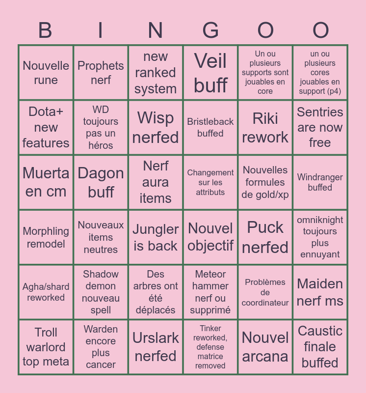 This bingo card has 36 words: Meteor hammer nerf ou supprimé, Des arbres ont été déplacés, Tinker reworked, defense matrice removed, Dota+ new features, Morphling remodel, Changement sur les attributs, WD toujours pas un héros, Urslark nerfed, Un ou plusieurs supports sont jouables en core, Problèmes de coordinateur, Sentries are now free, Veil buff, Maiden nerf ms, Dagon buff, Bristleback buffed, Nouvelle rune, Agha/shard reworked, Nouvelles formules de gold/xp, Muerta en cm, new ranked system, Nerf aura items, Nouveaux items neutres, Nouvel objectif, Jungler is back, Puck nerfed, Prophets nerf, Riki rework, Warden encore plus cancer, Wisp nerfed, un ou plusieurs cores jouables en support (p4), Caustic finale buffed, Troll warlord top meta, omniknight toujours plus ennuyant, Windranger buffed, Shadow demon nouveau spell and Nouvel arcana.