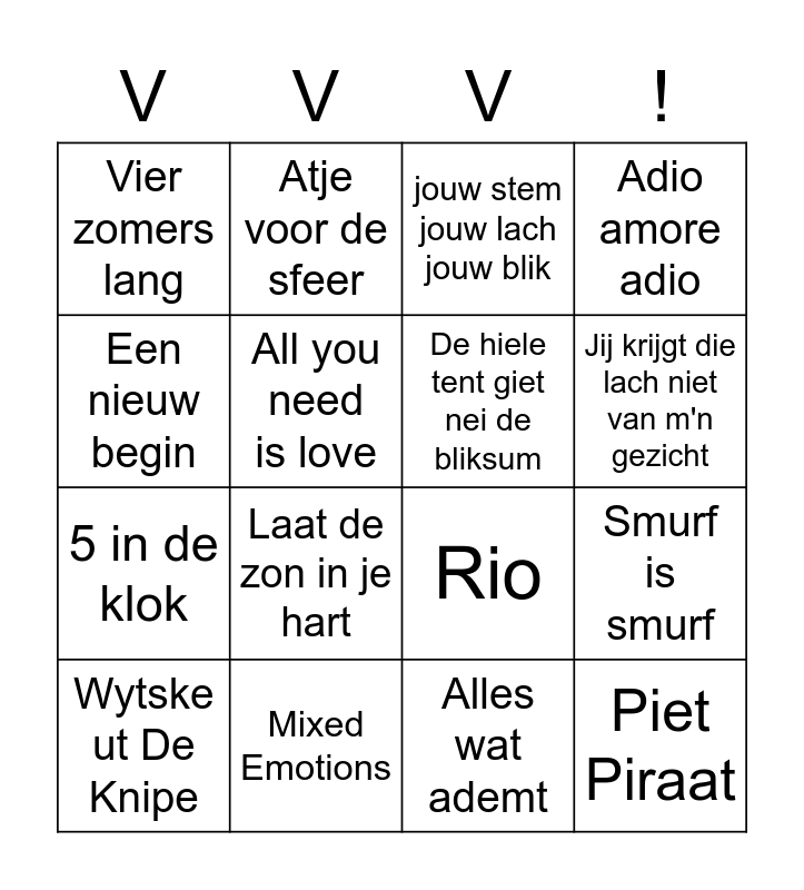 This bingo card has 37 words: Hey Suzie, Ik heb 'n truck als m'n woning, Met de vlam in de pijp, De hiele tent giet nei de bliksum, Myn alde puch, Bierrrr, Jij krijgt die lach niet van m'n gezicht, Dancing Queen, Een nieuw begin, Baby makes her blue jeans talk, Smurf is smurf, Adio amore adio, Wytske ut De Knipe, Alles wat ademt, All you need is love, Piet Piraat, Daar in dat kleine cafe aan de haven, jouw stem jouw lach jouw blik, Het bananen lied, Mixed Emotions, Vier zomers lang, Laat de zon in je hart, Una paloma Blanca, Steeds weer huil je, Pretty Belinda, Ik ben kachel, Atje voor de sfeer, Huisje op wielen, Jij denkt maar dat je alles mag van mij, Schatje mag ik je foto, Boeren aan de macht, Engelen bewaarder, Rio, ons moeder zeej nog, 't dondert en 't bliksemt, 5 in de klok and Toedeloe.