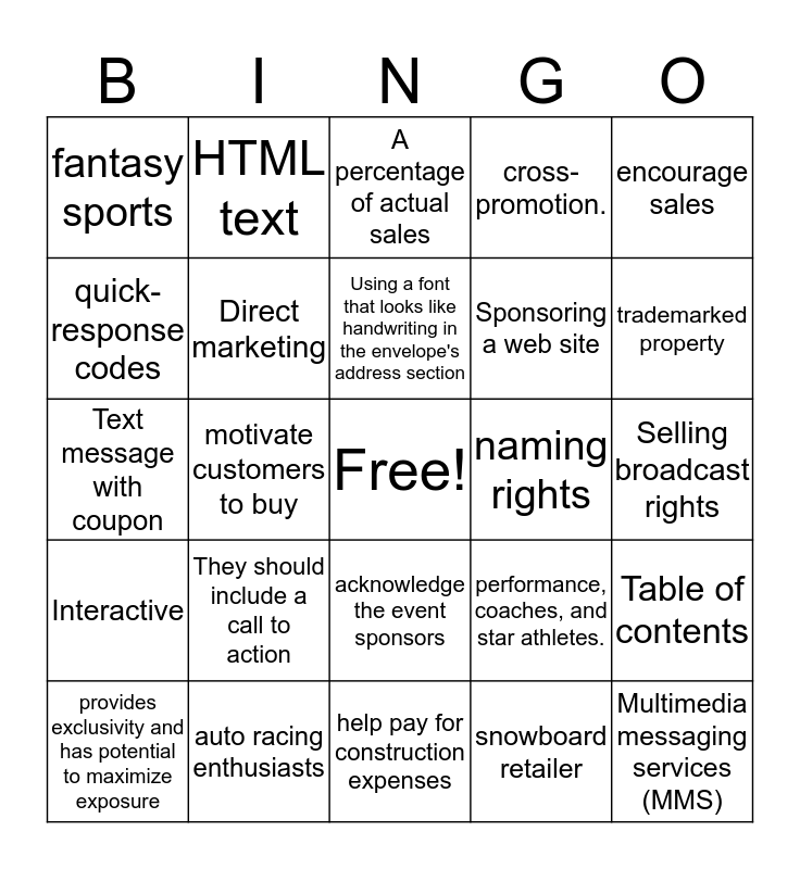 This bingo card has a free space and 24 words: They should include a call to action, auto racing enthusiasts, Using a font that looks like handwriting in the envelope's address section, provides exclusivity and has potential to maximize exposure, encourage sales, fantasy sports, quick-response codes, HTML text, naming rights, acknowledge the event sponsors, Sponsoring a web site, Text message with coupon, performance, coaches, and star athletes., Table of contents, Direct marketing, snowboard retailer, Selling broadcast rights, A percentage of actual sales, trademarked property, motivate customers to buy, Multimedia messaging services (MMS), Interactive, cross-promotion. and help pay for construction expenses.