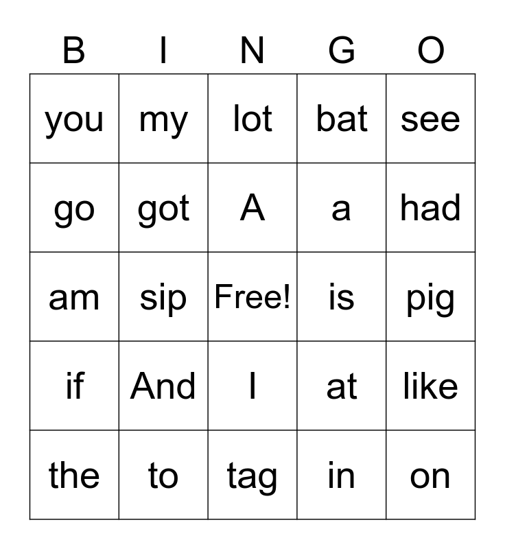 This bingo card has a free space and 24 words: And, to, A, the, see, you, go, my, is, I, a, am, at, like, got, in, pig, lot, had, sip, on, if, bat and tag.