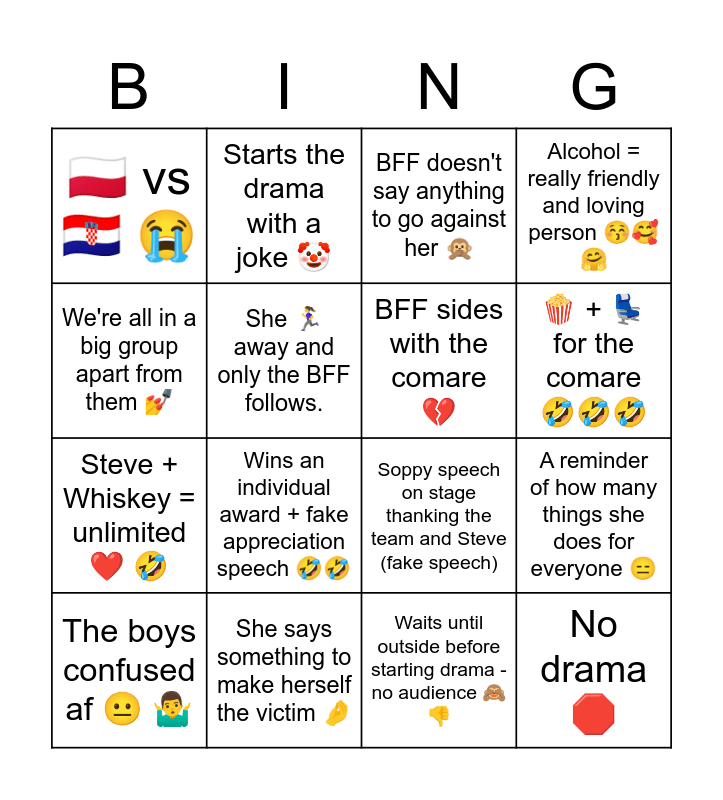 This bingo card has 16 words: She says something to make herself the victim 🤌, A reminder of how many things she does for everyone 😑, BFF doesn't say anything to go against her 🙊, 🇵🇱 vs 🇭🇷 😭, Steve + Whiskey = unlimited ❤️ 🤣, Starts the drama with a joke 🤡, Soppy speech on stage thanking the team and Steve (fake speech), Waits until outside before starting drama - no audience 🙈👎, We're all in a big group apart from them 💅, She 🏃♀️ away and only the BFF follows., The boys confused af 😐 🤷♂️, Alcohol = really friendly and loving person 😚🥰🤗, Wins an individual award + fake appreciation speech 🤣🤣, 🍿 + 💺 for the comare 🤣🤣🤣, BFF sides with the comare 💔 and No drama 🛑.