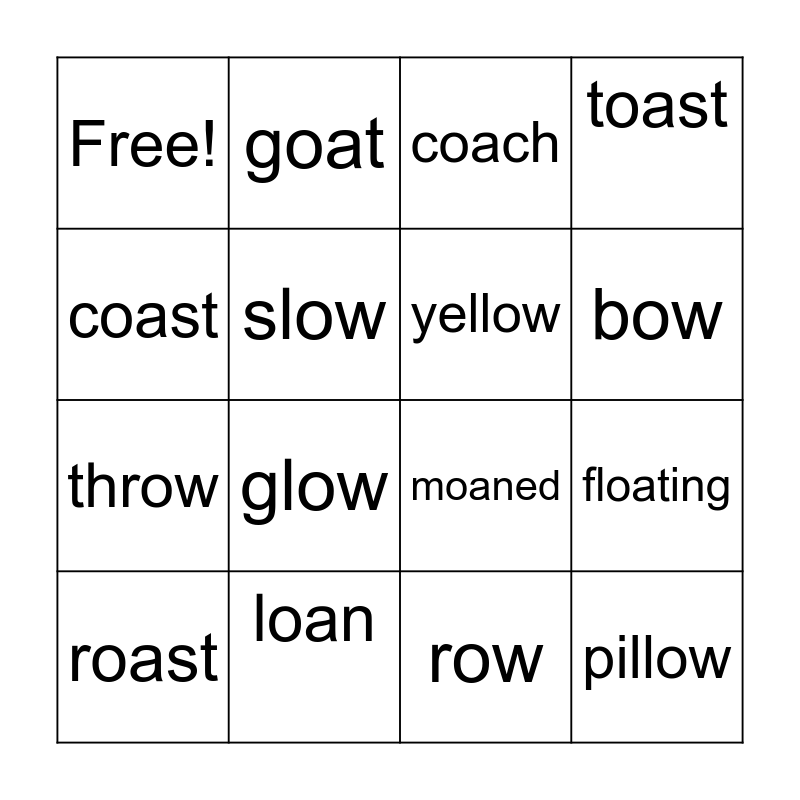 This bingo card has 16 words: roast, loan, coach, toast, coast, goat, moaned, floating, Free!, slow, row, bow, throw, glow, yellow and pillow.