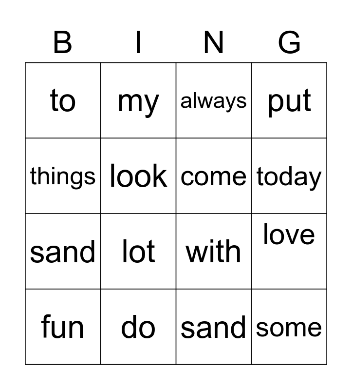 This bingo card has 20 words: love, go, always, there, fun, things, do, to, sand, my, lot, with, look, some, come, happy, today, put, sand and stuff.