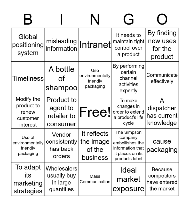 This bingo card has a free space and 24 words: Vendor consistently has back orders, Wholesalers usually buy in large quantities, Use environmentally friendly packaging, To adapt its marketing strategies, By finding new uses for the product, Global positioning system, Timeliness, misleading information, To make changes in order to extend a product's life cycle, It reflects the image of the business, By performing certain channel activities expertly, Modify the product to renew customer interest, The Simpson company embellishes the information that it places on its products label, cause packaging, A bottle of shampoo, Ideal market exposure, A dispatcher has current knowledge, Intranet, Communicate effectively, Product to agent to retailer to consumer, Because competitors have entered the market, Use of environmentally friendly packaging, It needs to maintain tight control over a product and Mass Communication.