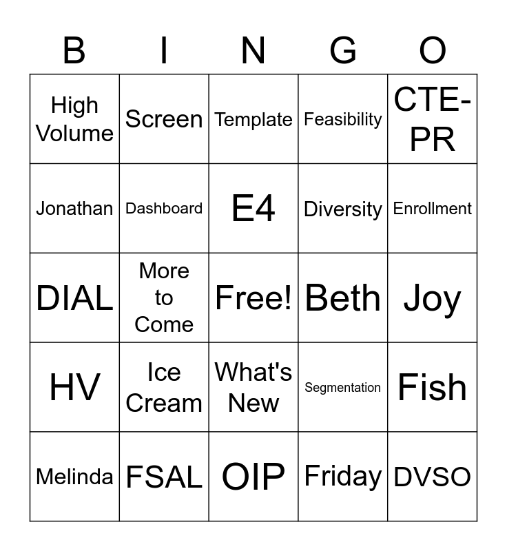 This bingo card has a free space and 29 words: Melinda, SSPL, More to Come, Performance Analyst, High Volume, Template, Dashboard, Ice Cream, Beth, FSAL, Joy, DVSO, OIP, Friday, Enrollment, Study Team, What's New, HV, CTE-PR, DIAL, Segmentation, Report, Diversity, Jonathan, Feasibility, Screen, Fish, E4 and Model.
