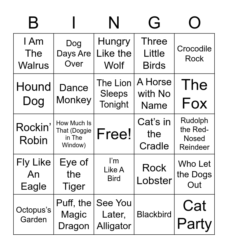 This bingo card has a free space and 24 words: Eye of the Tiger, Puff, the Magic Dragon, The Lion Sleeps Tonight, Octopus’s Garden, Crocodile Rock, I Am The Walrus, Hound Dog, Dog Days Are Over, Cat’s in the Cradle, I’m Like A Bird, A Horse with No Name, Rockin’ Robin, Rock Lobster, Who Let the Dogs Out, Dance Monkey, Blackbird, Rudolph the Red-Nosed Reindeer, Hungry Like the Wolf, The Fox, How Much Is That (Doggie in The Window), Cat Party, Fly Like An Eagle, Three Little Birds and See You Later, Alligator.