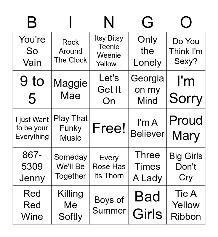 This bingo card has a free space and 110 words: The Twist, Hey Jude, I'm A Believer, Aquarius, Sugar, Sugar, Heart of Glass, YMCA, Summer Nights, Imagine, Bohemian Rhapsody, I Wanna Hold Your Hand, I Heard it Through the Grapevine, Are You Lonesome Tonight?, I Can't Stop Loving You, Hello Dolly, How Deep is your Love, I just Want to be your Everything, Best of my Love, Hot Stuff, Raindrops Keep Falling on my Head, Big Girls Don't Cry, Sugar Shack, Honky Tonk Women, Sitting on the Dock of the Bay, Big Bad John, Let's Get It On, Do You Think I'm Sexy?, Evergreen, Boogie Oggie Oggie, American Pie, I'm Sorry, Only the Lonely, Itsy Bitsy Teenie Weenie Yellow..., Save the Last Dance for Me, My Sharona, Tie A Yellow Ribbon, I Think I Love You, I'll Be There, Killing Me Softly, Lay Down Sally, Beyond the Sea, Wonderful World, Georgia on my Mind, Play That Funky Music, Three Times A Lady, Knock Three Times, Let It Be, Rhinestone Cowboy, Joy to the World, Don't it make my Brown Eyes Blue, Philadelphia Freedom, Still, Bad Girls, Disco Duck, The Way We Were, The Best of My Love, It's Too Late, You Make Me Feel Like Dancing, Close To You, Maggie Mae, You're So Vain, If You Leave Me Now, Midnight Train to Georgia, Shake Your Booty, Bridge Over Troubled Water, Someday We'll Be Together, Bad, Bad Leroy Brown, Undercover Angel, Miss You, Brandy, My Sweet Lord, Touch Me In the Morning, Rock Around The Clock, For Once In My Life, Hooked on a Feeling, Everyday People, Build Me Up Buttercup, Proud Mary, Son of a Preacher Man, Sara Smile, You've Made Me So Very Happy, Sweet Caroline, I Can't Get Next To You, We Are Family, Witchy Woman, Rock & Roll Fantasy, Joy to the World, Rock With You, Long Run, I Wanna be your Lover, Don't Stand So Close, 9 to 5, Always on my Mind, 867-5309 Jenny, Hurt So Good, I Wanna Know What Love Is, Born in the USA, Just My Imagination, Carless Whisper, Boys of Summer, What Have You Done For Me Lately, Take Me Home Tonight, Here I Go Again, Red Red Wine, Every Rose Has Its Thorn, Janie's Got A Gun, Free Fallin, Take Good Care of my Baby, Runaround Sue and Stand By Me.