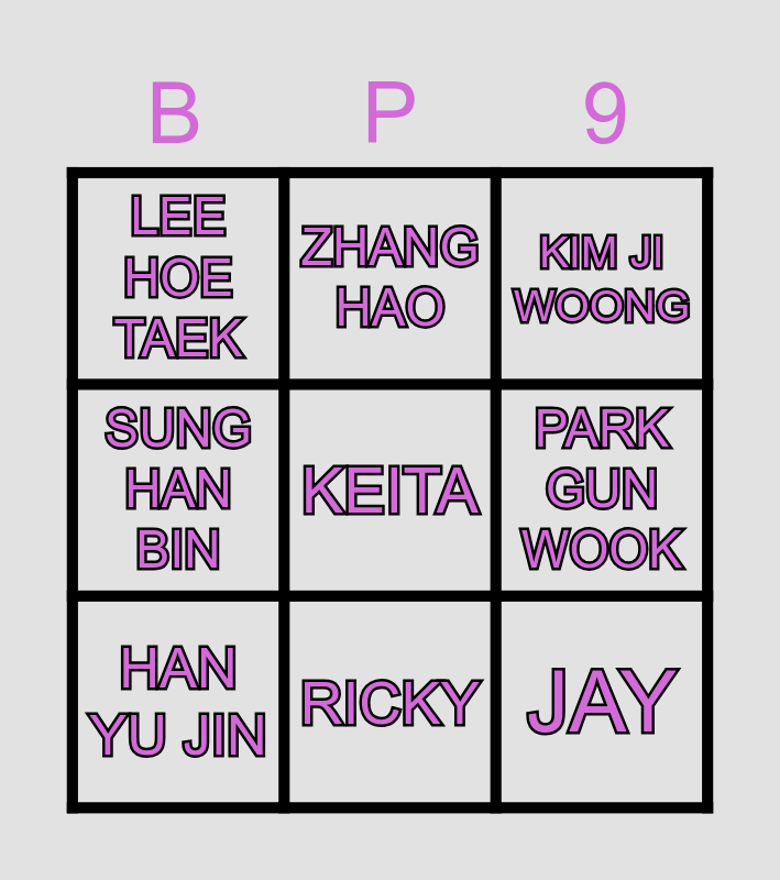 This bingo card has 9 words: HAN YU JIN, KEITA, KIM JI WOONG, LEE HOE TAEK, ZHANG HAO, PARK GUN WOOK, SUNG HAN BIN, RICKY and JAY.