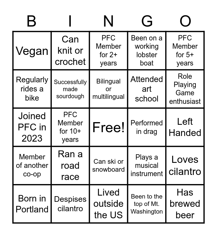 This bingo card has a free space and 24 words: Ran a road race, Despises cilantro, Bilingual or multilingual, Born in Portland, PFC Member for 5+ years, Vegan, Regularly rides a bike, Can knit or crochet, Performed in drag, Can ski or snowboard, Attended art school, Joined PFC in 2023, Plays a musical instrument, Loves cilantro, Successfully made sourdough, Been to the top of Mt. Washington, Left Handed, PFC Member for 2+ years, Role Playing Game enthusiast, PFC Member for 10+ years, Has brewed beer, Member of another co-op, Been on a working lobster boat and Lived outside the US.