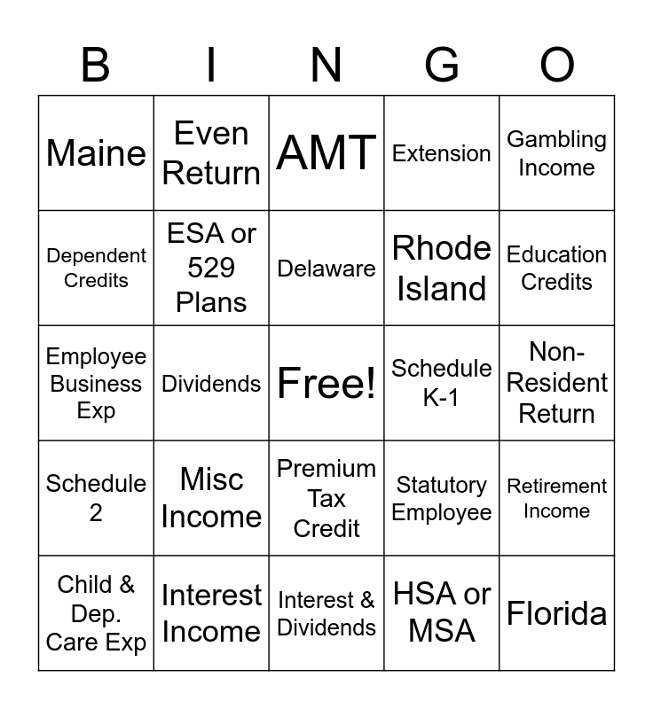 This bingo card has a free space and 74 words: 3+ States, Alimony, AMT, Back Door Roth, Cancellation of Debt, Capital Gains/Losses, CCA/RITA, Change Accounting Method, Child & Dep. Care Exp, Clergy Housing, Credit Card Income, Cryptocurrency, Delaware, Dependent Credits, Detroit, Dividends, Earned Income Credit, Education Credits, Education Expenses, Employee Business Exp, ESA or 529 Plans, Even Return, Extension, Farming Income, Florida, Foreign Income Excl, Foreign Tax Credit, Form 1041, Form 1065, Form 1120-S, Gambling Income, Government Payments, Hobby Income, Home Office, Household Employees, HSA or MSA, Income Averaging, Injured Spouse, Innocent Spouse, Installment Sale, Interest & Dividends, Interest Income, Investment Income, Itemized Deductions, Kansas City, Maine, Military Spouse, Misc Income, Montana, Mortgage Interest, New Hampshire, Non-Employee Comp, Non-Resident Return, North Dakota, NYC/Yonkers, Original Issue Discount, Premium Tax Credit, QBI, Reciprocal States, Retirement Income, Rhode Island, Schedule 1, Schedule 2, Schedule 3, Schedule K-1, Schedule K-3, Schedule SE, Sole Prioprietorship, Statutory Employee, Supplemental Income, Tuition Payments, Underpayment Penalty, Ureported Tips and Vermont.