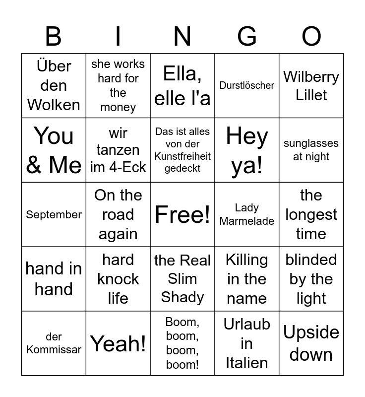 This bingo card has a free space and 35 words: Say my name, bad guy, tainted love, wir tanzen im 4-Eck, the Real Slim Shady, Durstlöscher, You & Me, Crazy in Love, Das ist alles von der Kunstfreiheit gedeckt, the Fresh Prince of Bel-Air, September, Wilberry Lillet, Everytime we touch, Beat it, Über den Wolken, Lady Marmelade, Urlaub in Italien, On the road again, hand in hand, Upside down, Killing in the name, der Kommissar, blinded by the light, Yeah!, Ella, elle l'a, sunglasses at night, Golden Brown, Another one bites the dust, Hey ya!, the longest time, Survivor, Boom, boom, boom, boom!, hard knock life, she works hard for the money and bello e impossibile.