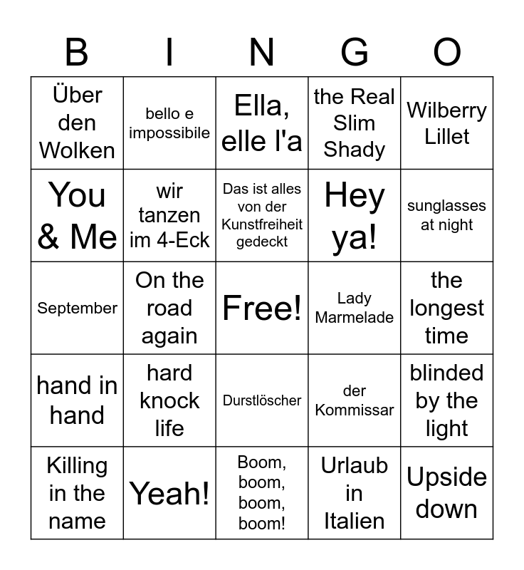 This bingo card has a free space and 35 words: bad guy, Say my name, tainted love, wir tanzen im 4-Eck, Durstlöscher, the Real Slim Shady, You & Me, Crazy in Love, Das ist alles von der Kunstfreiheit gedeckt, the Fresh Prince of Bel-Air, September, Wilberry Lillet, Everytime we touch, Beat it, Über den Wolken, Lady Marmelade, Urlaub in Italien, On the road again, hand in hand, Upside down, der Kommissar, Killing in the name, blinded by the light, Yeah!, Ella, elle l'a, sunglasses at night, Golden Brown, Another one bites the dust, Hey ya!, the longest time, Survivor, Boom, boom, boom, boom!, hard knock life, bello e impossibile and she works hard for the money.