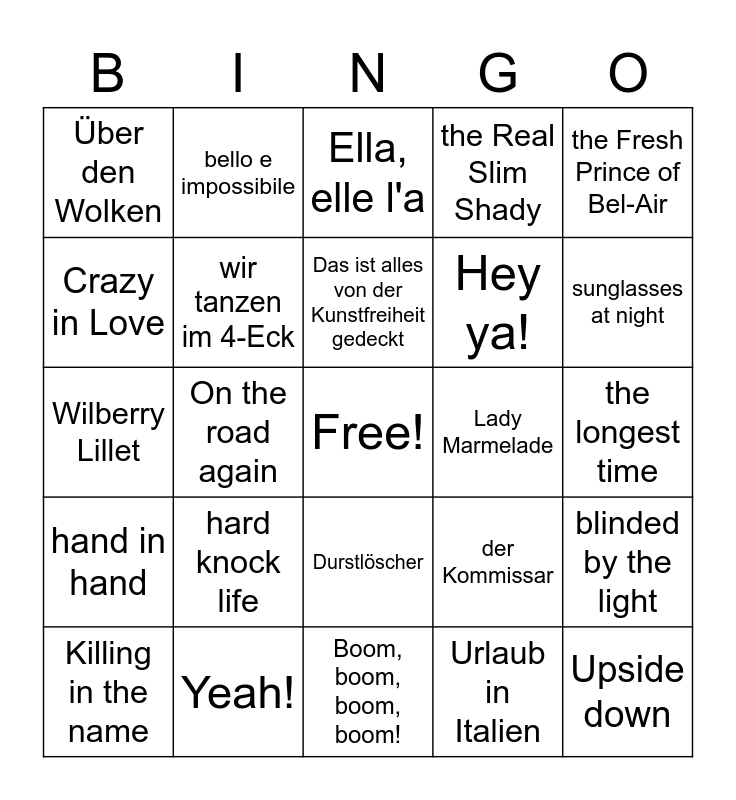 This bingo card has a free space and 35 words: bad guy, Say my name, tainted love, wir tanzen im 4-Eck, Durstlöscher, the Real Slim Shady, Crazy in Love, You & Me, Das ist alles von der Kunstfreiheit gedeckt, September, Wilberry Lillet, the Fresh Prince of Bel-Air, Everytime we touch, Beat it, Über den Wolken, Lady Marmelade, Urlaub in Italien, On the road again, hand in hand, Upside down, der Kommissar, Killing in the name, blinded by the light, Yeah!, Ella, elle l'a, sunglasses at night, Golden Brown, Another one bites the dust, Hey ya!, the longest time, Survivor, Boom, boom, boom, boom!, hard knock life, bello e impossibile and she works hard for the money.