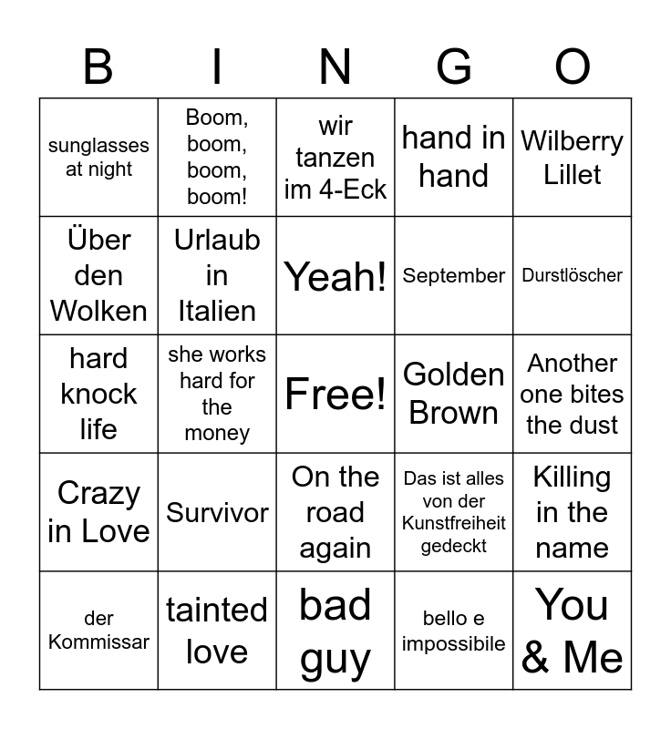 This bingo card has a free space and 35 words: blinded by the light, Everytime we touch, Beat it, Urlaub in Italien, On the road again, hand in hand, Über den Wolken, Lady Marmelade, Yeah!, Upside down, hard knock life, Wilberry Lillet, the Fresh Prince of Bel-Air, Ella, elle l'a, sunglasses at night, Golden Brown, bello e impossibile, she works hard for the money, Crazy in Love, You & Me, Das ist alles von der Kunstfreiheit gedeckt, der Kommissar, Killing in the name, tainted love, wir tanzen im 4-Eck, Durstlöscher, the Real Slim Shady, the longest time, September, Another one bites the dust, Hey ya!, bad guy, Survivor, Boom, boom, boom, boom! and Say my name.