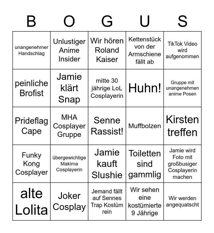 This bingo card has a free space and 24 words: übergewichtige Makima Cosplayerin, Joker Cosplay, mitte 30 jährige LoL Cosplayerin, alte Lolita, TikTok Video wird aufgenommen, unangenehmer Handschlag, peinliche Brofist, Unlustiger Anime Insider, Muffbolzen, Jamie kauft Slushie, Huhn!, Prideflag Cape, Toiletten sind gammlig, Jamie wird Foto mit großbusiger Cosplayerin machen, Jamie klärt Snap, Wir sehen eine kostümierte 9 Jährige, Kirsten treffen, Wir hören Roland Kaiser, Gruppe mit unangenehmen anime Posen, MHA Cosplayer Gruppe, Wir werden angequatscht, Funky Kong Cosplayer, Kettenstück von der Armschiene fällt ab and Jemand fällt auf Sennes Trap Kostüm rein.