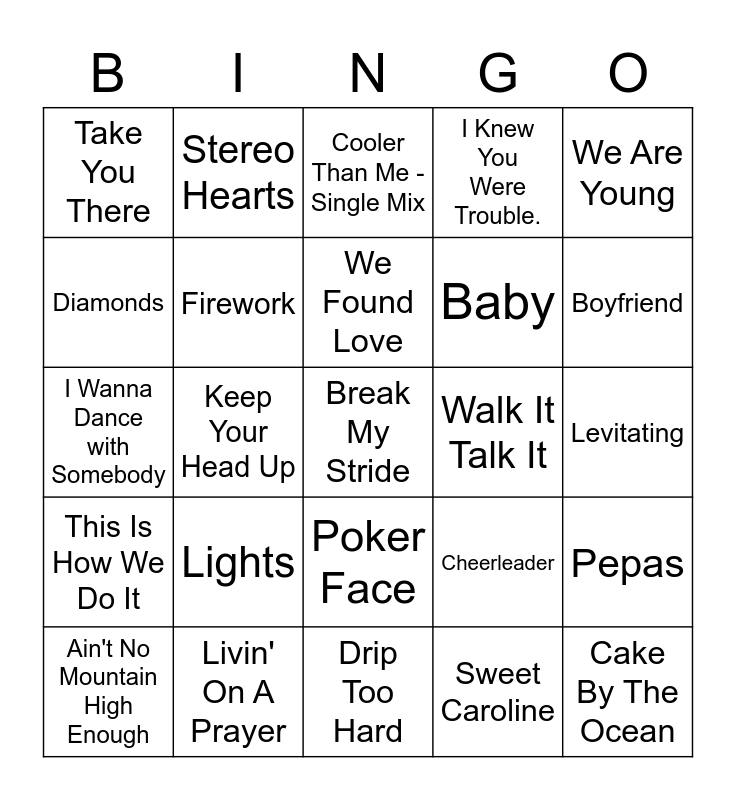 This bingo card has 76 words: Free!, Crank That, Cooler Than Me - Single Mix, Yeah!, Low, Beautiful Girls, Party In The U.S.A., Sunflower, Feel This Moment, Just Dance, Cake By The Ocean, Umbrella, We Found Love, Diamonds, Honey, I'm Good., Keep Your Head Up, Good Time, Break My Stride, Don't Stop The Music, We Are Young, Riptide, I Wanna Dance with Somebody, Firework, Stereo Hearts, I Knew You Were Trouble., Beauty And A Beat, Eenie Meenie - Radio Version, When I Was Your Man, Talking to the Moon, I Want It That Way, Before He Cheats, Replay, Shake It Off, Cheerleader, Boyfriend, Baby, Life is a Highway, Timber, Levitating, Sweet Caroline, Feel So Close, Classic, Cheap Thrills, Chandelier, Halo, Single Ladies, Ain't No Mountain High Enough, Take You There, See You Again, Last Christmas, All Your'n, Poker Face, Fergalicious, All Falls Down, You Belong With Me, Axel F, Fire Burning, Temperature, Hey Baby (Drop It to the Floor), Memories, Lights, The Way I Are, Sweater Weather, Empire State Of Mind, Can't Hold Us, Stir Fry, Walk It Talk It, Mr. Brightside, Bohemian Rhapsody, You Give Love A Bad Name, Pepas, This Is How We Do It, Livin' On A Prayer, 20 Min, Drip Too Hard and Pure Cocaine.