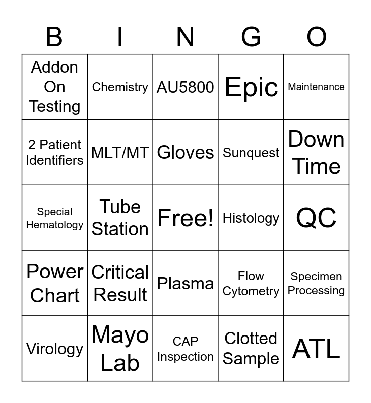 This bingo card has a free space and 67 words: Urinalysis, Coagulation, Hematology, Specimen Processing, Reference Lab, Differentials, Chemistry, Lab Coat, Gloves, Serum, Plasma, Hemolyzed Sample, QC, Maintenance, Unlabeled Specimens, 2 Patient Identifiers, Tube Station, Addon On Testing, Faxed Result, Sunquest, Critical Result, Power Chart, Epic, Clotted Sample, Centrifuge, 24 Hour Urine, Gas Lab, Leaky Urine Cup, Down Time, Morning Huddle, ATL, Serology, Special Chem, Tissue Typing, Microbiology, Virology, MGP, Flow Cytometry, Special Hematology, Surgical Pathology, Cytology, MLT/MT, Histology, Blood, Stool, Aliquot, Quest, Mayo Lab, Med Speed, Body Fluids, AU5800, DxI, Labels, DXH, Competency, CAP Inspection, Risk Master, Overtime, Media Lab, Continuing Education, Requisitions, Stago, Cellavision, Reagent, Stat, Routine and Z Labels.