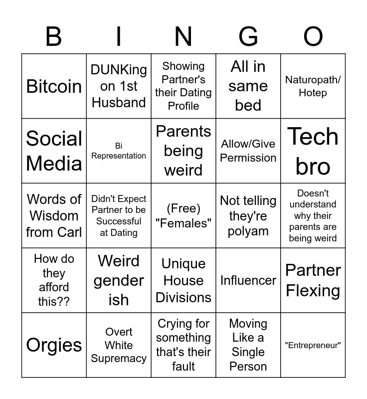 This bingo card has a free space and 39 words: 2nd Husband, 5th Man, Cheating, Polysaturated, Bi Representation, Orgies, Unique House Divisions, Parents being weird, "My Partner and I want" but it's really just Partner, Naturopath/ Hotep, How do they afford this??, Didn't Expect Partner to be Successful at Dating, All in same bed, "Entrepreneur", Doesn't understand why their parents are being weird, Not telling they're polyam, Weird gender ish, Super Controlling, Bitcoin, Kids Think it's Weird, Influencer, Social Media, Crying for something that's their fault, Allow/Give Permission, Tech bro, Queerphobia, "Greedy", mononorm, Pump the Breaks, Messy Strangers, DUNKing on 1st Husband, Weird First Date, ex-fundie, Showing Partner's their Dating Profile, Overt White Supremacy, Moving Like a Single Person, Basic, Partner Flexing, Words of Wisdom from Carl and "Unhinged".