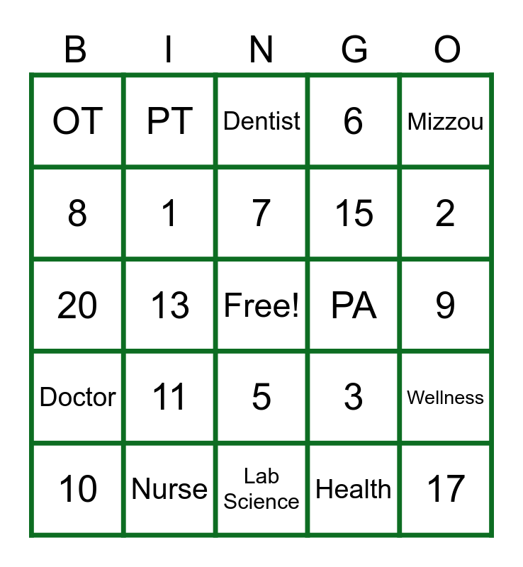 This bingo card has a free space and 25 words: Doctor, Nurse, Lab Science, Health, Mizzou, OT, PT, Dentist, PA, Wellness, 8, 1, 4, 3, 2, 10, 13, 7, 15, 9, 20, 11, 5, 6 and 17.