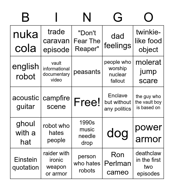 This bingo card has a free space and 24 words: robot who hates people, raider with ironic weapon or armor, peasants, Einstein quotation, twinkie-like food object, nuka cola, english robot, trade caravan episode, Enclave but without any politics, 1990s music needle drop, people who worship nuclear fallout, acoustic guitar, dog, power armor, vault informational documentary video, Ron Perlman cameo, the guy who the vault boy is based on, "Don't Fear The Reaper", molerat jump scare, campfire scene, deathclaw in the first two episodes, ghoul with a hat, dad feelings and person who hates robots.