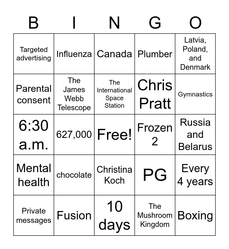 This bingo card has a free space and 59 words: Salt Lake City, Fusion, 1972, $710 million, Every 4 years, Colorado, The James Webb Telescope, 4, Frozen 2, 1996, Parental consent, Transplants, Chris Pratt, Paris, 10:30 p.m., Influenza, The International Space Station, Plumber, The IOC, 6:30 a.m., 627,000, Canada, Brooklyn, Russia and Belarus, Louisiana, Artificial intelligence, Christina Koch, Luigi, Latvia, Poland, and Denmark, Meta, An astroid, The Greek god Apollo, A pipe, World Cup, Targeted advertising, Newborn rats' brains, African American, PG, Afghanistan, Mental health, HIV infection, 10 days, The Mushroom Kingdom, 1 year and 2 months, Privacy, Baking soda, Artemis 2, Nintendo, Gymnastics, Private messages, Antarctica, November, 2024, 5.7/10, Boxing, 18, chocolate, 2025, 1983 and 70.