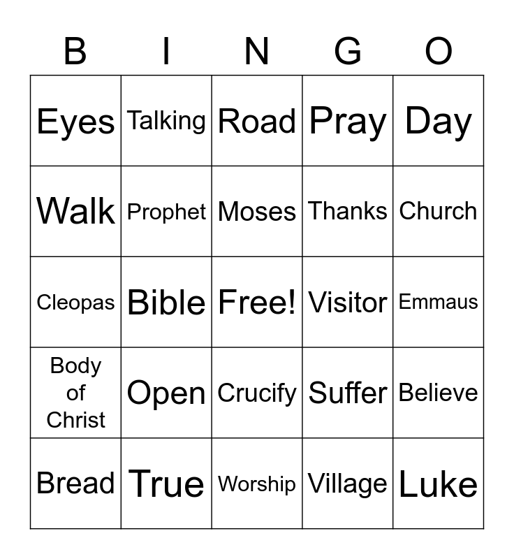 This bingo card has a free space and 24 words: Open, True, Moses, Bread, Day, Eyes, Walk, Talking, Visitor, Crucify, Thanks, Cleopas, Suffer, Believe, Prophet, Village, Emmaus, Road, Church, Bible, Luke, Body of Christ, Pray and Worship.