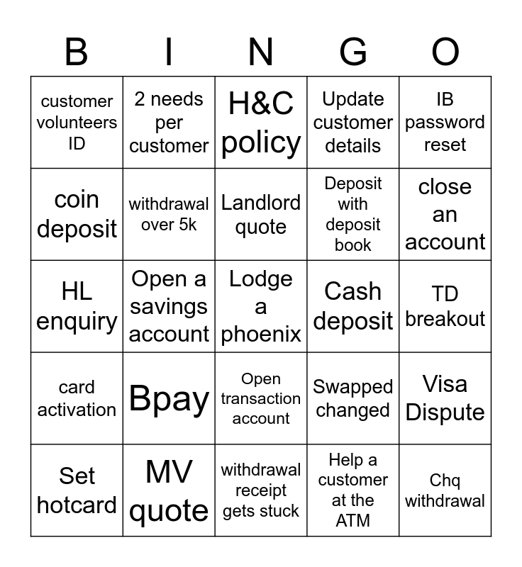 This bingo card has 32 words: Help a customer at the ATM, Transaction listing, Open a savings account, Take Customer in to the Office, card activation, withdrawal over 5k, IB password reset, Visa Dispute, 2 needs per customer, Chq withdrawal, Landlord quote, H&C policy, Third Party transaction, TD rate enquiry, Cash deposit, IB registration, Set hotcard, HL enquiry, Open transaction account, Bpay, Swapped changed, Chq deposit, TD breakout, MV quote, Lodge a phoenix, Update customer details, Deposit with deposit book, coin deposit, customer volunteers ID, withdrawal receipt gets stuck, PL enquiry and close an account.