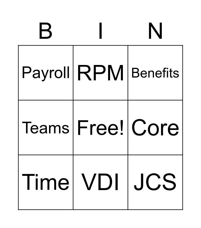 This bingo card has a free space and 21 words: Incident, Updates, RPM, Testing, Absence, Time, Payroll, Benefits, Escalate, VDI, PingID, Teams, Outlook, HRConnect, Core, SNow, Resolved, Timesheet, JCS, DC and EMBT.