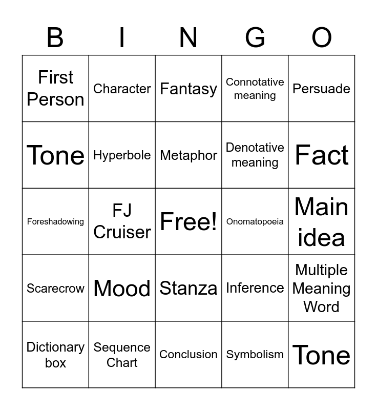 This bingo card has a free space and 71 words: Author’s Purpose, Character, Glinda, Climax, Conclusion, Conflict, Connotative meaning, Context Clues, Denotative meaning, Findley, Dictionary box, Entertain, Fact, First Person, Flashback, Foreshadowing, Inference, Persuade, Inform, Main idea, Mood, Tone, Multiple Meaning Word, Opinion, Outline, Paired selections, Plot, Point of View, Problem/Resolution, Sequence, Sequence Chart, Setting, Summarize, Supporting Details, Symbolism, Theme, Third Person limited, Third person Omniscient, Tone, Venn Diagram, Stanza, Stage direction, Scarecrow, Alliteration, Sound effects, Figurative language, George Clooney, Hyperbole, Personification, Idiom, Irony, Character trait, Onomatopoeia, Physical trait, Pictograph, P.O.E., Metaphor, Simile, Synonym, Protagonist, Antagonist, Rising Action, FJ Cruiser, Dialogue, Quotation marks, Non-Fiction, Fantasy, Myth, Folktale, Rule of Three and Cause/Effect.