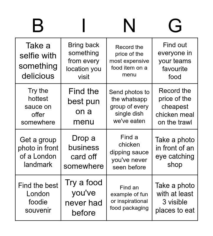 This bingo card has 16 words: Try a food you've never had before, Take a photo in front of an eye catching shop, Record the price of the most expensive food item on a menu, Take a selfie with something delicious, Get a group photo in front of a London landmark, Bring back something from every location you visit, Find a chicken dipping sauce you've never seen before, Find an example of fun or inspirational food packaging, Try the hottest sauce on offer somewhere, Find the best pun on a menu, Find the best London foodie souvenir, Find out everyone in your teams favourite food, Drop a business card off somewhere, Record the price of the cheapest chicken meal on the trawl, Send photos to the whatsapp group of every single dish we've eaten and Take a photo with at least 3 visible places to eat.