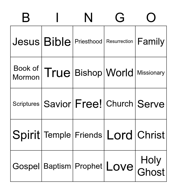 This bingo card has a free space and 24 words: Temple, Baptism, Bishop, Gospel, Family, Jesus, Book of Mormon, Bible, Church, Friends, World, Scriptures, Lord, Christ, True, Love, Serve, Priesthood, Missionary, Savior, Holy Ghost, Spirit, Resurrection and Prophet.