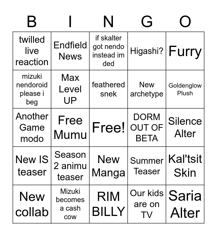 This bingo card has a free space and 24 words: Season 2 animu teaser, Mizuki becomes a cash cow, feathered snek, New collab, Furry, twilled live reaction, mizuki nendoroid please i beg, Endfield News, DORM OUT OF BETA, New Manga, New archetype, Another Game modo, Summer Teaser, Kal'tsit Skin, Max Level UP, Our kids are on TV, Silence Alter, if skalter got nendo instead im ded, Goldenglow Plush, Free Mumu, Saria Alter, New IS teaser, Higashi? and RIM BILLY.