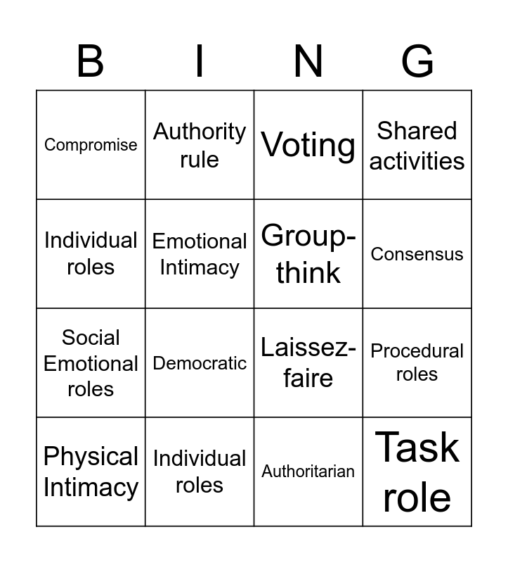 This bingo card has 16 words: Individual roles, Procedural roles, Voting, Compromise, Social Emotional roles, Authority rule, Laissez-faire, Authoritarian, Individual roles, Emotional Intimacy, Physical Intimacy, Shared activities, Democratic, Consensus, Group-think and Task role.