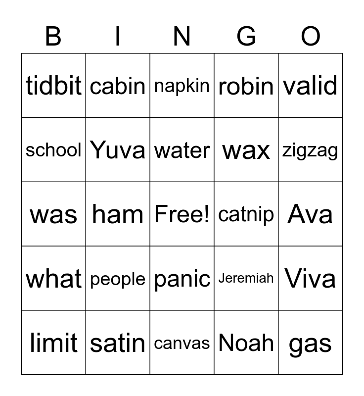 This bingo card has a free space and 24 words: people, satin, water, limit, valid, tidbit, school, cabin, catnip, panic, wax, was, Jeremiah, Viva, Yuva, Noah, Ava, napkin, zigzag, ham, gas, what, robin and canvas.