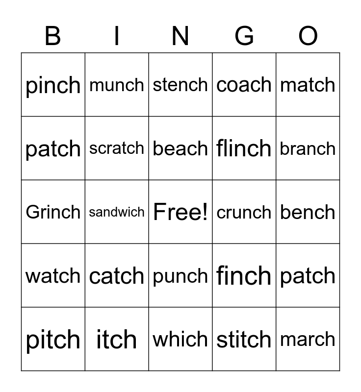 This bingo card has a free space and 24 words: catch, itch, beach, pitch, match, pinch, patch, munch, crunch, punch, flinch, Grinch, finch, patch, scratch, stitch, bench, stench, branch, sandwich, march, watch, coach and which.