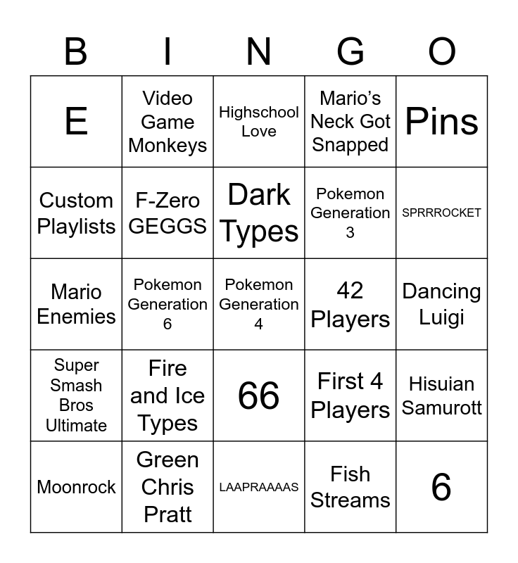 This bingo card has 85 words: Script Hype, Shuckle Hype, Highschool Love, 69, Dewgong - Pokerap, Staravia = TinTin, MagCARgo, RIP Booyah, Koffing not a ghost type, Merry, Ultimate longest Bingo, Moments done quickly, F-Zero GEGGS, 42 Players, Community Spotlights, E, Moonrock, Custom Playlists, Numbers, Pokemon Generation 1, Pokemon Generation 2, Pokemon Generation 3, Pokemon Generation 4, Pokemon Generation 5, Pokemon Generation 6, Ghost Types, Mario Kart, Boo’s, Mario Party Boards, Animal Crossing, Fire and Ice Types, Gym, E4 and Champions, Mario Power Ups, Mario Enemies, 6, Amp Hype, LAAPRAAAAS, Luigi Casino, Super Smash Bros Ultimate, SPRRROCKET, 64, 21st April 2021, Chicken and Ice Cream, Grass types, Mega Man Robot Masters, Mario Kart Tour, Everything Luigi, Hatsune Miku, Bugsnax, Water Pokemon, Video Game Monkeys, Dark Types, Zelda Items, Nintendo Villains, Mario Characters, Double Winners, Green Chris Pratt, Mario’s Neck Got Snapped, Daddy Cake Legs, Party Phil, Iron Boots, Shiny Pokemon Giveaways, Shenanigans, DOZ DIS KOUNT, Wheel, Pins, Speedrun, Hisuian Samurott, Sus Plush, No Buttfarts, Minecraft Wolf, Banana, Baby Koala Mario, Sign Ups, Our Own Role, 66, Fish Streams, Wii Party, Tekken Tag 2, Murder By Numbers, Dancing Luigi, Paper Mario Sticker Star, Yakuza 0, First 4 Players and Dra-Gaggle.
