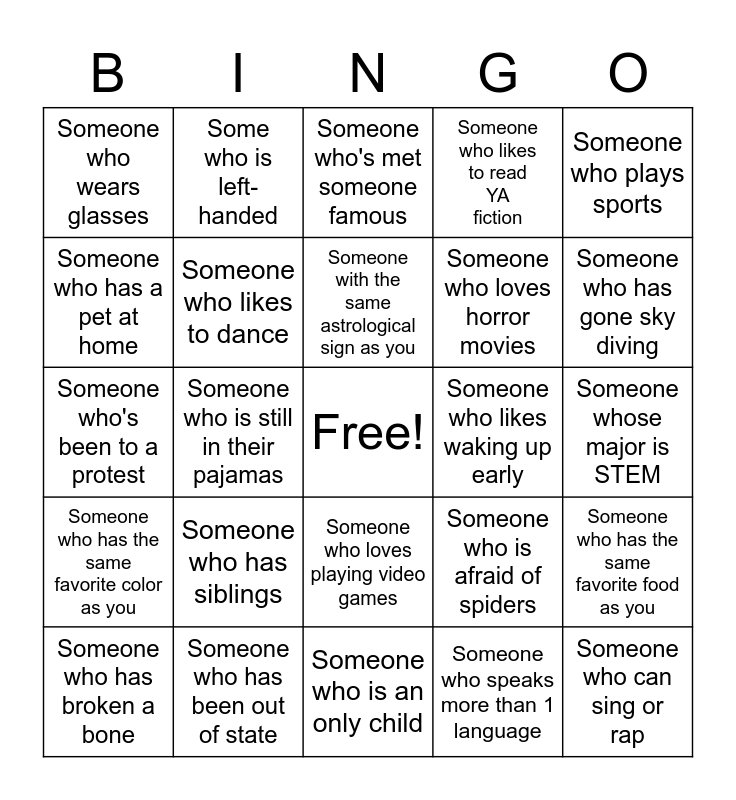 This bingo card has a free space and 24 words: Someone who has siblings, Someone who has been out of state, Someone with the same astrological sign as you, Someone who has broken a bone, Someone who plays sports, Someone who wears glasses, Someone who has a pet at home, Some who is left-handed, Someone who likes waking up early, Someone who loves playing video games, Someone who loves horror movies, Someone who's been to a protest, Someone who is afraid of spiders, Someone who has the same favorite food as you, Someone who likes to dance, Someone who speaks more than 1 language, Someone whose major is STEM, Someone who's met someone famous, Someone who has gone sky diving, Someone who is still in their pajamas, Someone who can sing or rap, Someone who has the same favorite color as you, Someone who likes to read YA fiction and Someone who is an only child.