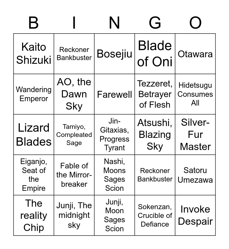 This bingo card has a free space and 24 words: Fable of the Mirror-breaker, Junji, The midnight sky, Farewell, The reality Chip, Otawara, Kaito Shizuki, Wandering Emperor, Reckoner Bankbuster, Atsushi, Blazing Sky, Nashi, Moons Sages Scion, Tezzeret, Betrayer of Flesh, Lizard Blades, Reckoner Bankbuster, Satoru Umezawa, AO, the Dawn Sky, Sokenzan, Crucible of Defiance, Silver-Fur Master, Bosejiu, Hidetsugu Consumes All, Tamiyo, Compleated Sage, Invoke Despair, Eiganjo, Seat of the Empire, Blade of Oni and Junji, Moon Sages Scion.