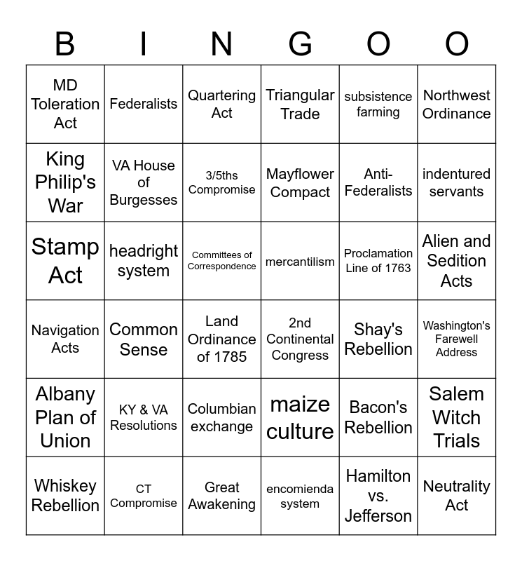 This bingo card has 36 words: maize culture, Columbian exchange, encomienda system, King Philip's War, Navigation Acts, mercantilism, VA House of Burgesses, Great Awakening, subsistence farming, Bacon's Rebellion, indentured servants, Triangular Trade, Salem Witch Trials, headright system, Mayflower Compact, MD Toleration Act, Albany Plan of Union, Proclamation Line of 1763, Stamp Act, Quartering Act, Committees of Correspondence, Common Sense, 2nd Continental Congress, Land Ordinance of 1785, Shay's Rebellion, Federalists, Anti-Federalists, CT Compromise, 3/5ths Compromise, Northwest Ordinance, Neutrality Act, Whiskey Rebellion, Washington's Farewell Address, Alien and Sedition Acts, KY & VA Resolutions and Hamilton vs. Jefferson.